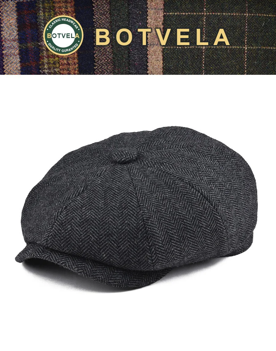 BOTVELA Wool Tweed Newsboy Cap Herringbone Men British Gatsby Retro Hat Driver Flat Cap for Male Vintage Herringbone Beret
